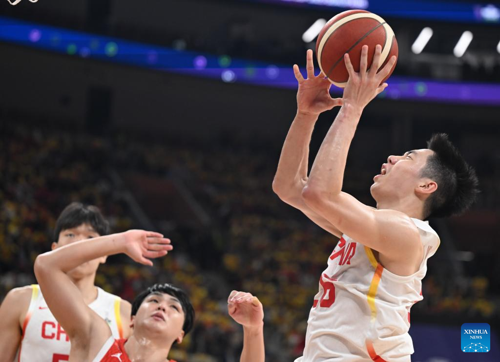 SHENZHEN, Feb. 20 (Xinhua) -- The Chinese men's basketball team won 100-58 over Japan in a Group C game of the 2025 FIBA Asia Cup qualifiers on Thursday evening, securing its place in the Asia Cup.