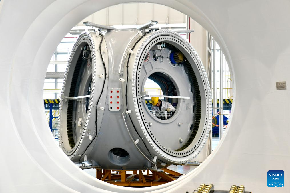 A staff member works in a wind power equipment production workshop of Sany Renewable Energy (Rizhao) Wind Power Equipment Manufacturing Co., Ltd. in Rizhao, east China's Shandong Province, Feb. 22, 2025. In recent years, local authorities in Rizhao have made efforts to assist traditional advantageous industries in innovating and develop an array of emerging and future-oriented industries. (Xinhua/Guo Xulei)