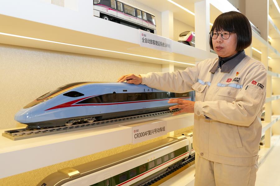 Sun Jingnan briefs on the production of Fuxing bullet trains she was engaged in, at the exhibition hall of the CRRC Nanjing Puzhen Co., Ltd. in Nanjing, east China's Jiangsu Province, Feb. 20, 2025. (Xinhua/Li Bo)