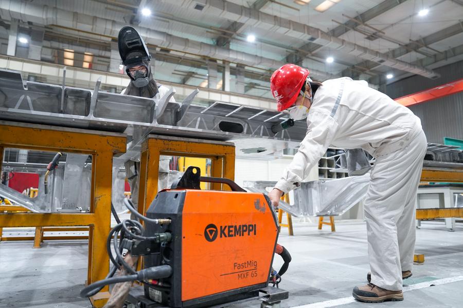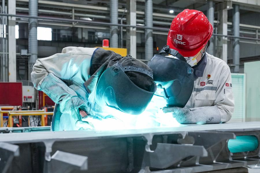 Sun Jingnan (R) instructs a colleague in welding operation at a workshop of the CRRC Nanjing Puzhen Co., Ltd. in Nanjing, east China's Jiangsu Province, Feb. 20, 2025. (Xinhua/Li Bo)