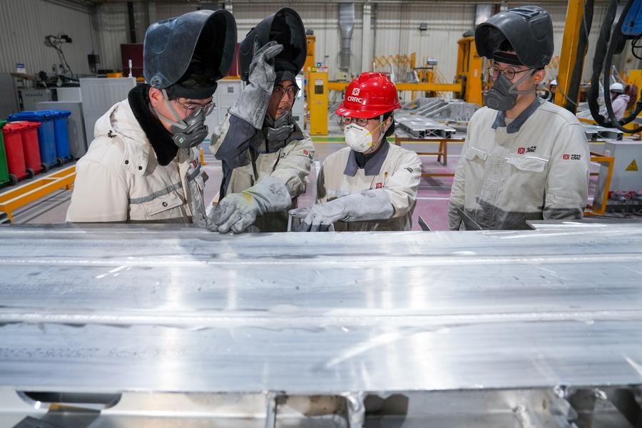 Sun Jingnan (2nd R) discusses welding techniques with colleagues at a workshop of the CRRC Nanjing Puzhen Co., Ltd. in Nanjing, east China's Jiangsu Province, Feb. 20, 2025. (Xinhua/Li Bo)