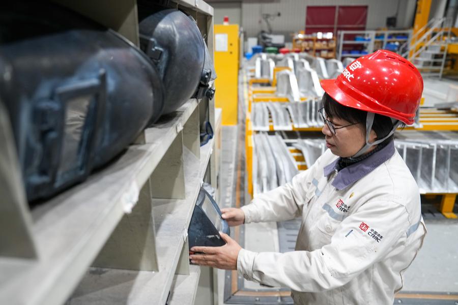 Sun Jingnan puts welding helmets in place at a workshop of the CRRC Nanjing Puzhen Co., Ltd. in Nanjing, east China's Jiangsu Province, Feb. 20, 2025. (Xinhua/Li Bo)