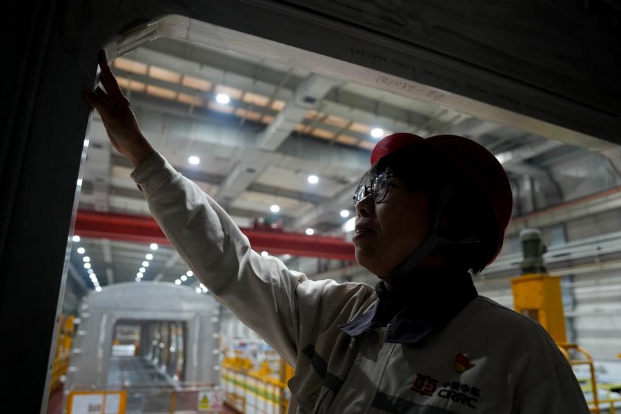 Sun Jingnan checks a welding job on a train carriage at a workshop of the CRRC Nanjing Puzhen Co., Ltd. in Nanjing, east China's Jiangsu Province, Feb. 20, 2025. (Xinhua/Li Bo)