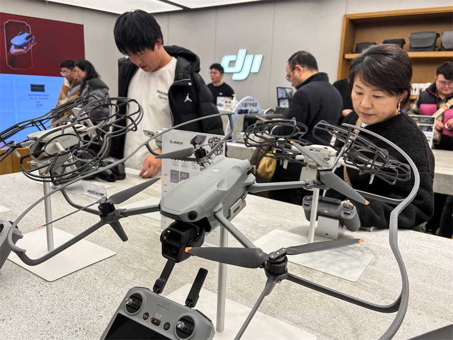 People experience products from Shenzhen-based drone manufacturer DJI at an outlet in Nanjing, Jiangsu province, on Feb 3. (Photo/China Daily)