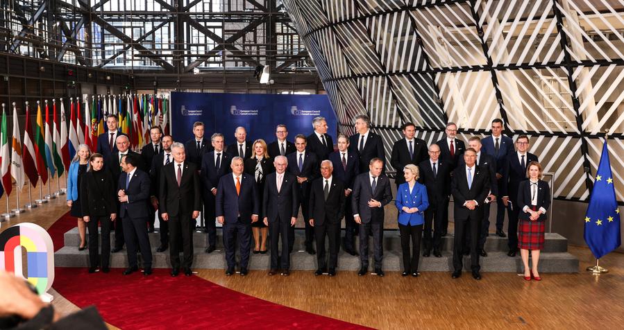 Attendees of a European Council summit pose for a group photo in Brussels, Belgium, Dec. 19, 2024. (Xinhua/Peng Ziyang)
