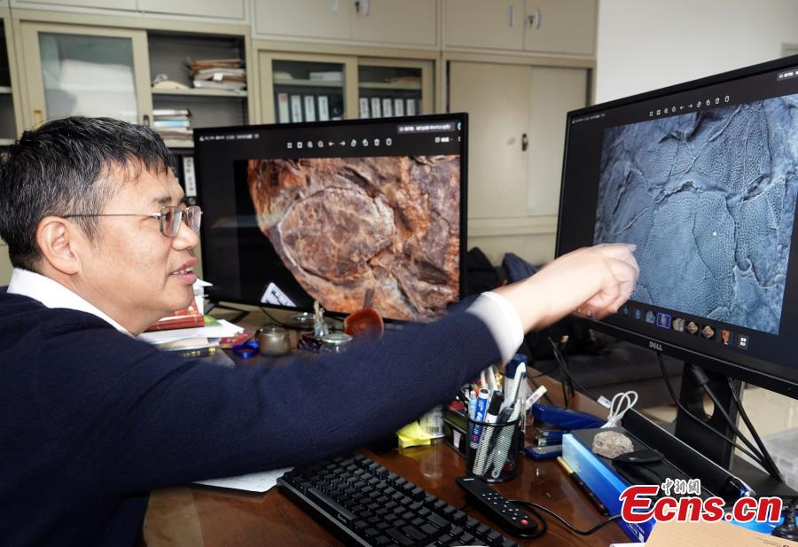 A researcher introduces the new paleofish species fossil, Bothriolepis zhujiangyuanensis, discovered in Qujing, Southwest China's Yunnan Province, Feb. 21, 2025. (China News Service/Sun Zifa)