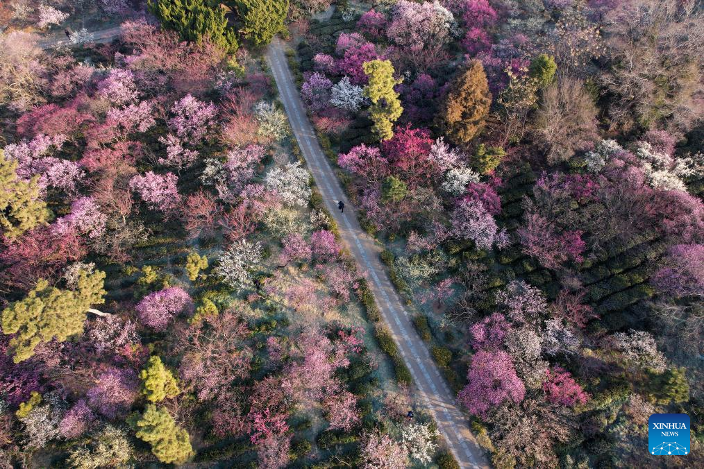 A drone photo taken on Feb 23, 2025 shows plum blossoms at a park in Guang'an District, Guang'an City, southwest China's Sichuan Province. (Photo by Zhang Guosheng/Xinhua)