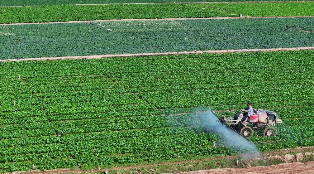 An aerial drone photo taken on Sept. 23, 2024 shows a farmer fertilizing vegetables in Xiaoba Township, Qingtongxia City in northwest China's Ningxia Hui Autonomous Region. (Xinhua/Yang Zhisen)