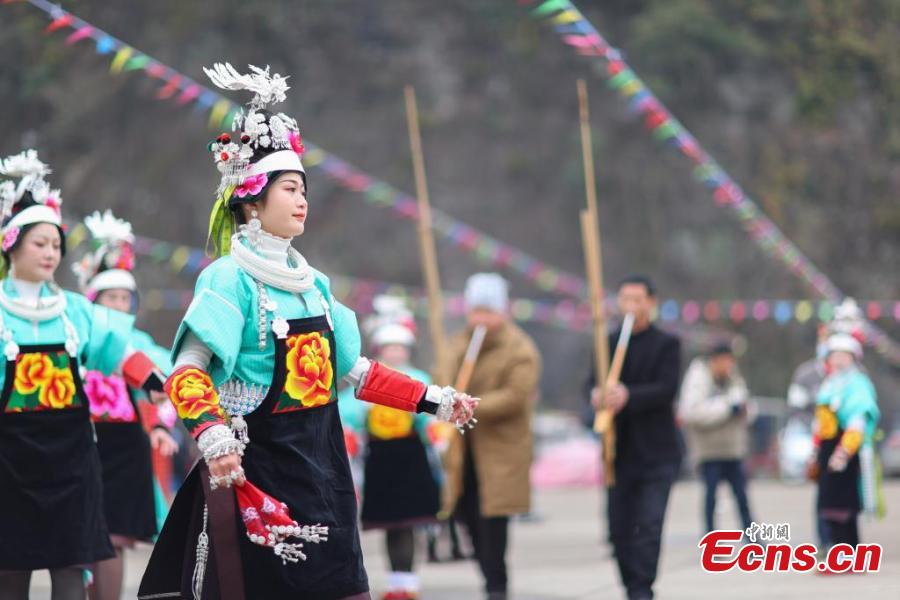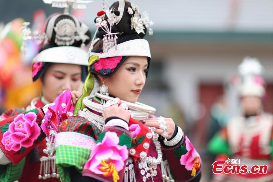 Women of the Miao ethnic group celebrate the "Wanghui" Festival in Danzhai county, southwest China's Guizhou Province, Mar. 15, 2018. (China News Service/Yang Wukui)