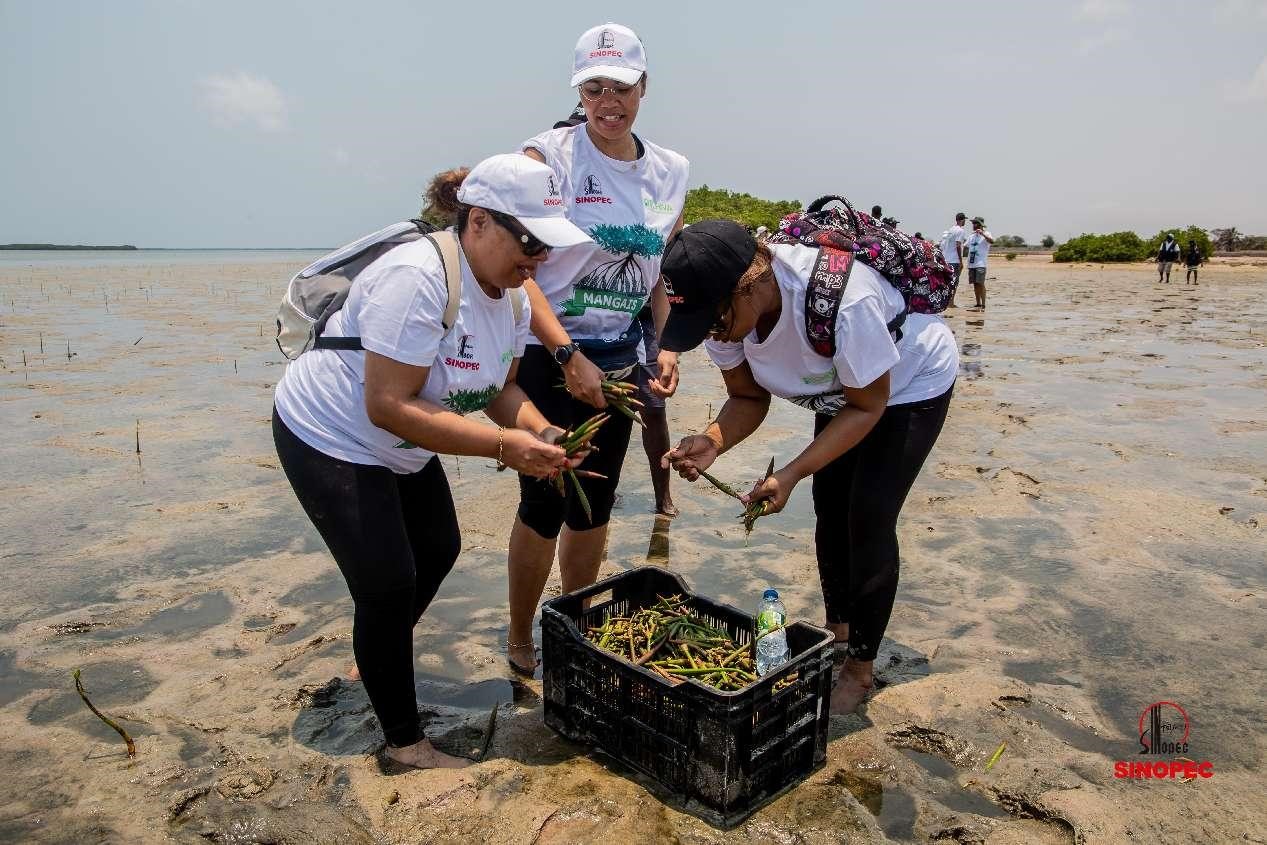 Employees of the Angolan branch of Sinopec International Petroleum Exploration and Production Corporation (SIPC) plant mangrove seedlings on a beach. (Photo/Zhao Xuchi)