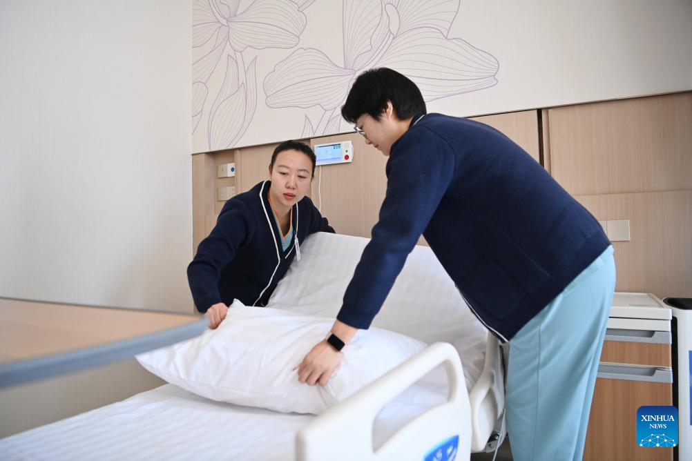 Nurses tidy up a bed at the Perennial General Hospital Tianjin in Xiqing District of north China's Tianjin Municipality, Feb. 26, 2025. The Perennial General Hospital Tianjin, China's first wholly foreign-owned, tertiary general hospital, opened to public service here on Wednesday. This 500-bed hospital was built and owned by Singapore's Perennial Holdings Private Limited, with a total investment of about 1 billion yuan (about 138 million U.S. dollars), capable of comprehensive services including individualized medication. (Xinhua/Li Ran)