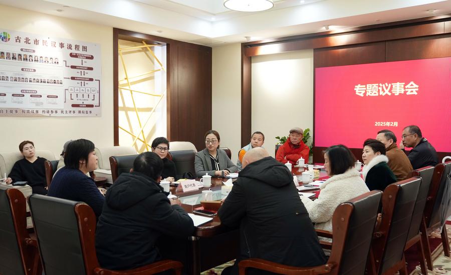 Sheng Hong (5th L) solicits suggestions on the development of community commerce from representatives of merchants and residents during a thematic discussion held at the Gubei civic center in Hongqiao Subdistrict of Changning District, east China's Shanghai, Feb. 12, 2025. (Xinhua/Liu Ying)