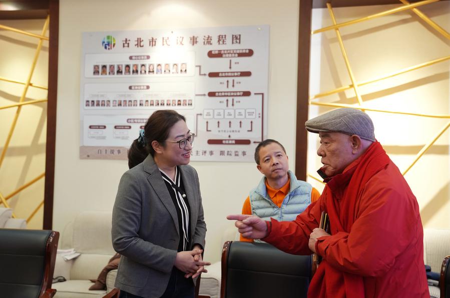 Sheng Hong (L) listens to a representative of the residents during a thematic discussion held at the Gubei civic center in Hongqiao Subdistrict of Changning District, east China's Shanghai, Feb. 12, 2025. (Xinhua/Liu Ying)