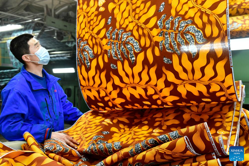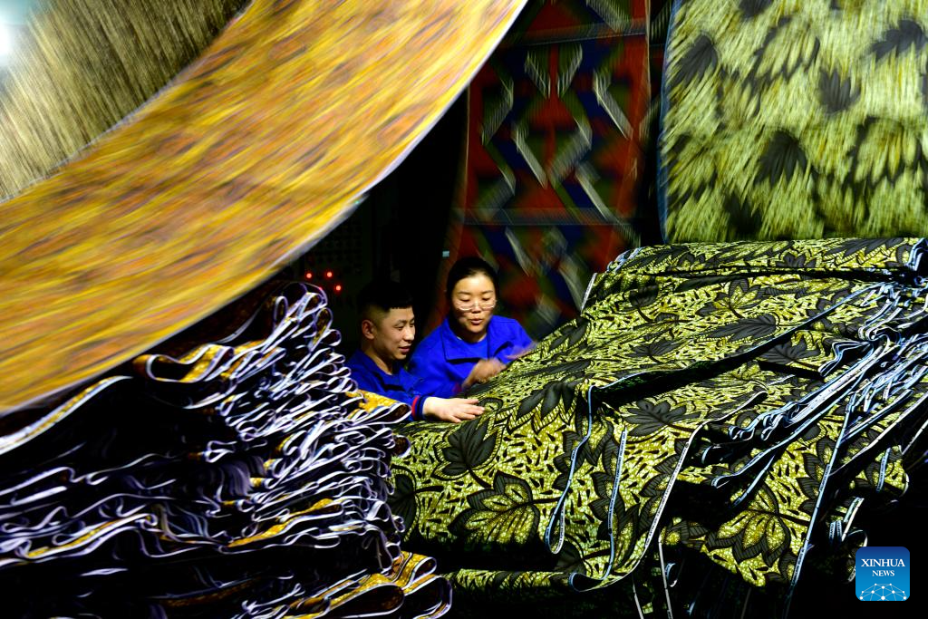 Workers check fabric for export to Africa at a workshop in Binzhou, east China's Shandong Province, Feb. 25, 2025. Binzhou City is a major hub for private enterprises. In recent years, the city has fostered the development of private economy through comprehensive and end-to-end services. (Xinhua/Guo Xulei)
