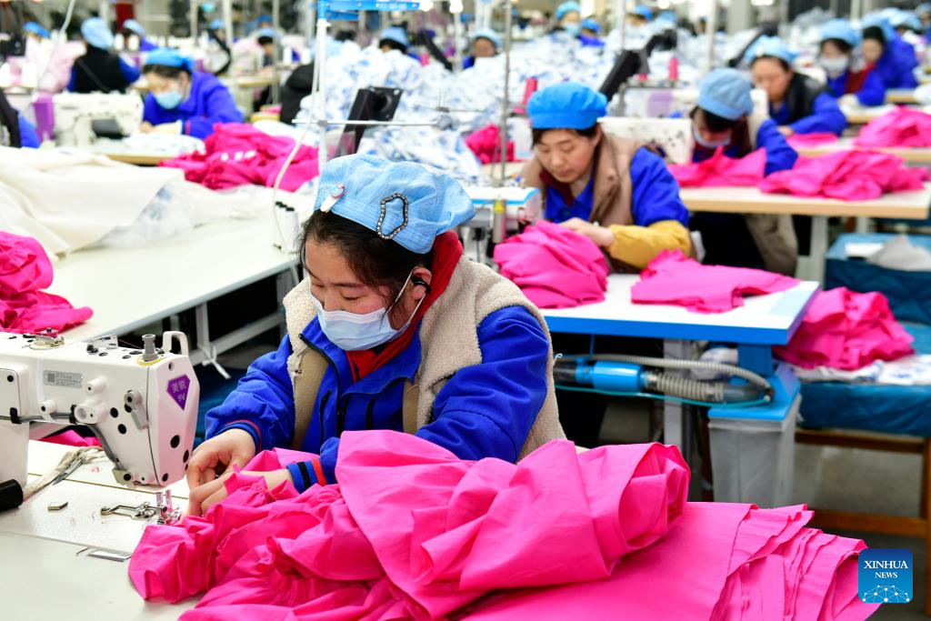 Workers process home textile products at a company in Binzhou, east China's Shandong Province, Feb. 25, 2025. Binzhou City is a major hub for private enterprises. In recent years, the city has fostered the development of private economy through comprehensive and end-to-end services. (Xinhua/Guo Xulei)