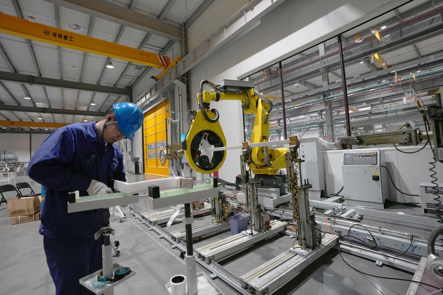 This photo taken on Feb. 26, 2025 shows smart equipment processing coil products at a coil factory in Harbin Electric Machinery Company Ltd. in Harbin, northeast China's Heilongjiang Province. (Xinhua/Wang Song)