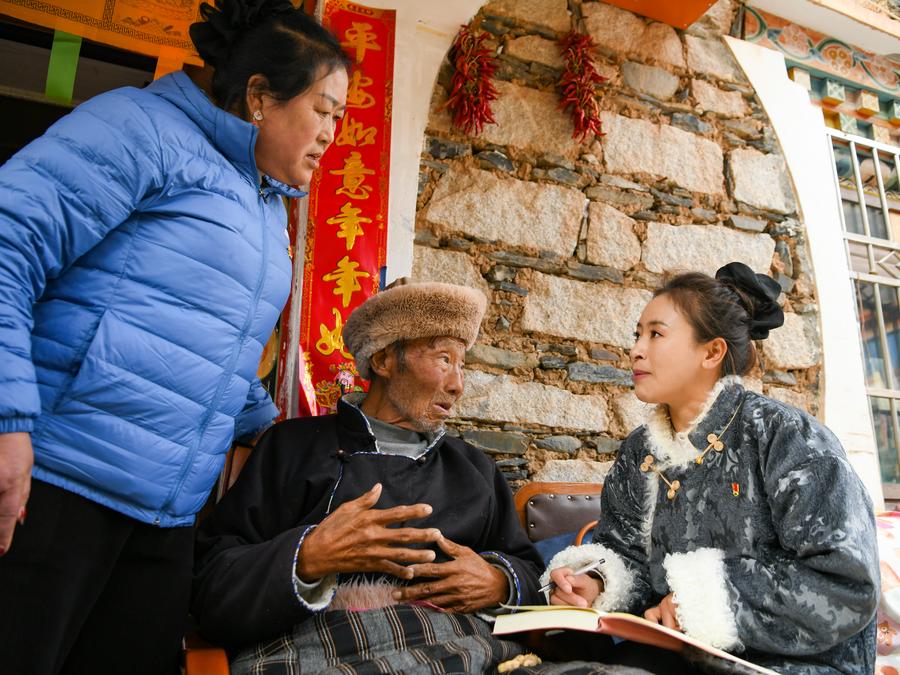 Gexi Wangmu (R) talks with seniors to learn about their daily living conditions in Songgang Village of Maerkang City, Aba Tibetan-Qiang Autonomous Prefecture, southwest China's Sichuan Province, Feb. 18, 2025. (Xinhua/Wang Xi)
