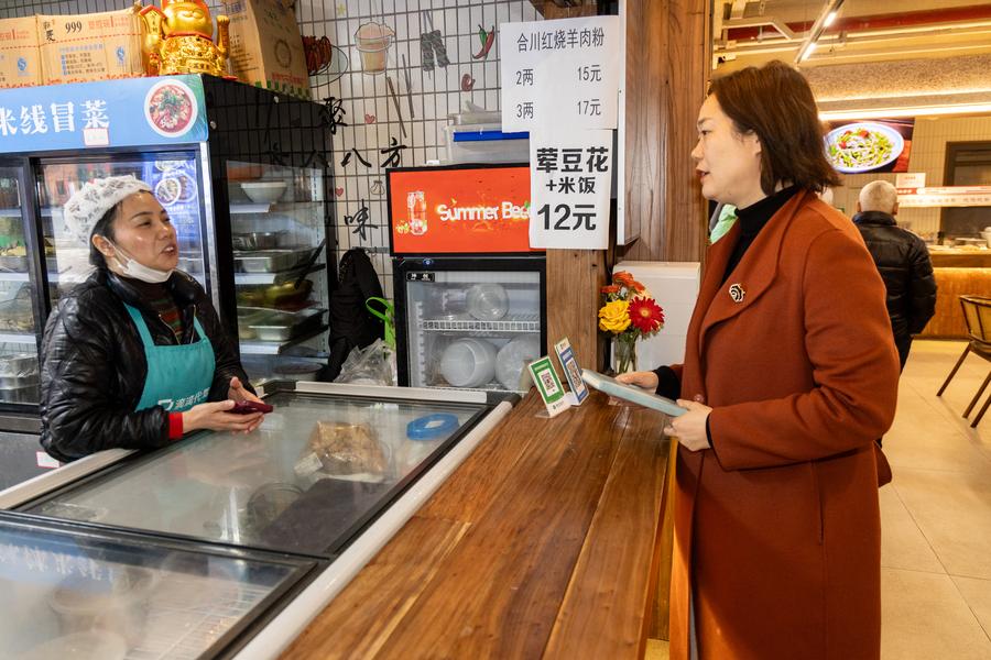 Wu Chengli learns about the operation of a community canteen at Minzhu Village Community in Xiejiawan Sub-district of Jiulongpo District, southwest China's Chongqing Municipality, Feb. 25, 2025. (Xinhua/Huang Wei)