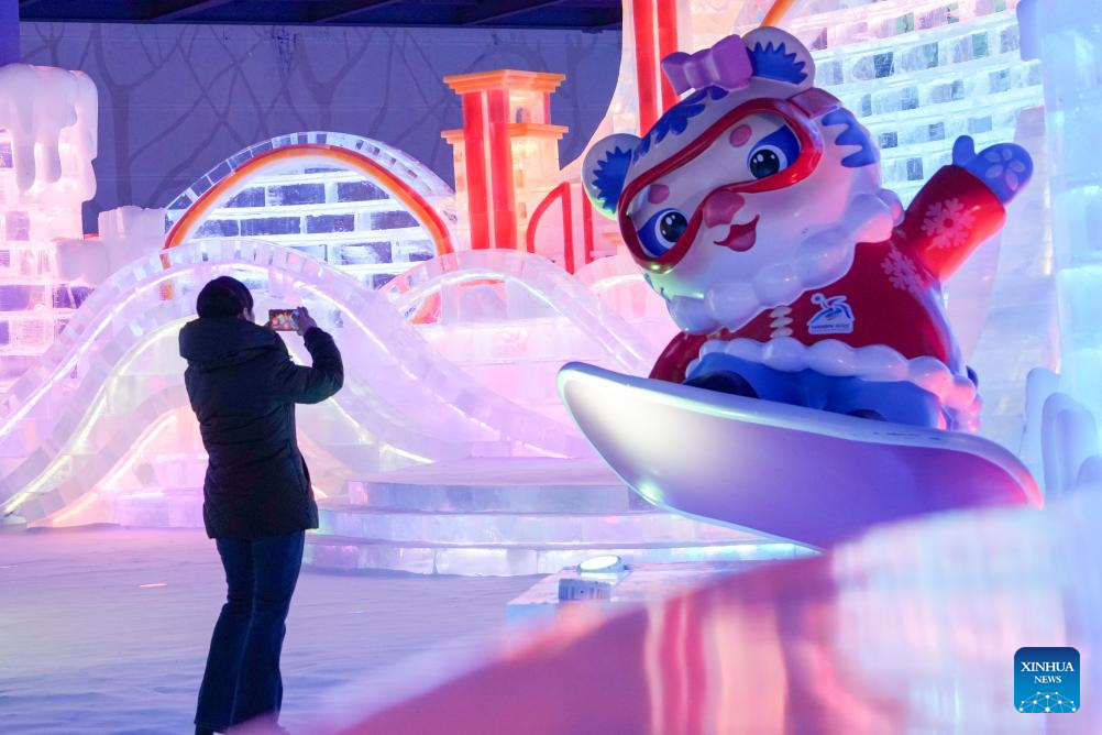 A visitor takes photos of Nini, a mascot of the 9th Asian Winter Games Harbin 2025, at an indoor ice-and-snow theme park within Harbin Ice-Snow World in Harbin, northeast China's Heilongjiang Province, Feb. 27, 2025. The world's largest indoor ice-and-snow theme park, a facility located within Harbin Ice-Snow World, reopened on Thursday morning as the outdoor Harbin Ice-Snow World officially closed its 26th edition on Wednesday. Covering an area of 23,000 square meters, the indoor ice-and-snow attraction has seen a comprehensive refurbishment. Initially launched in July 2024, the facility features advanced audio-visual interactivity, vibrant ice sculptures, and elements from past editions of the park and the 2025 Asian Winter Games. (Xinhua/Wang Jianwei)