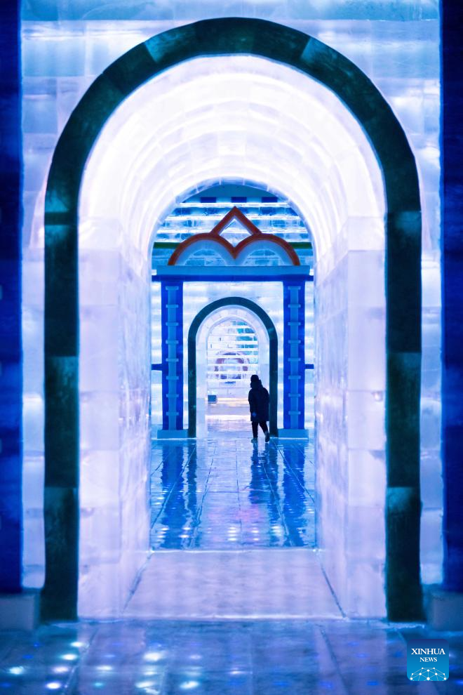 A visitor enjoys the ice-and-snow landscapes at an indoor ice-and-snow theme park within Harbin Ice-Snow World in Harbin, northeast China's Heilongjiang Province, Feb. 27, 2025. The world's largest indoor ice-and-snow theme park, a facility located within Harbin Ice-Snow World, reopened on Thursday morning as the outdoor Harbin Ice-Snow World officially closed its 26th edition on Wednesday. Covering an area of 23,000 square meters, the indoor ice-and-snow attraction has seen a comprehensive refurbishment. Initially launched in July 2024, the facility features advanced audio-visual interactivity, vibrant ice sculptures, and elements from past editions of the park and the 2025 Asian Winter Games. (Xinhua/Xie Jianfei)