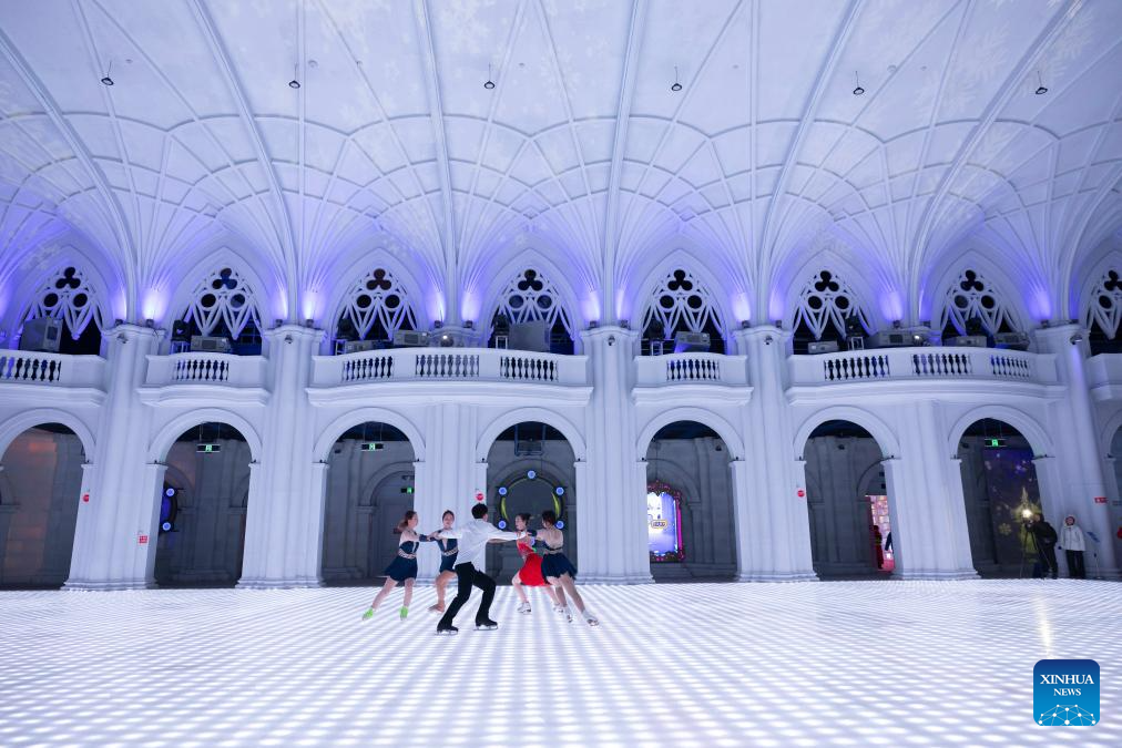 An ice dance performance is staged at an indoor ice-and-snow theme park within Harbin Ice-Snow World in Harbin, northeast China's Heilongjiang Province, Feb. 27, 2025. The world's largest indoor ice-and-snow theme park, a facility located within Harbin Ice-Snow World, reopened on Thursday morning as the outdoor Harbin Ice-Snow World officially closed its 26th edition on Wednesday. Covering an area of 23,000 square meters, the indoor ice-and-snow attraction has seen a comprehensive refurbishment. Initially launched in July 2024, the facility features advanced audio-visual interactivity, vibrant ice sculptures, and elements from past editions of the park and the 2025 Asian Winter Games. (Xinhua/Zhang Tao)