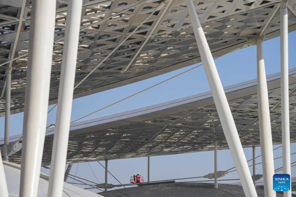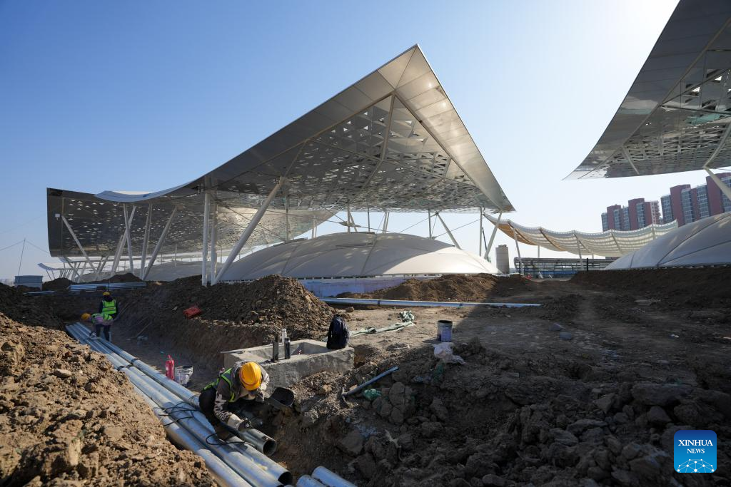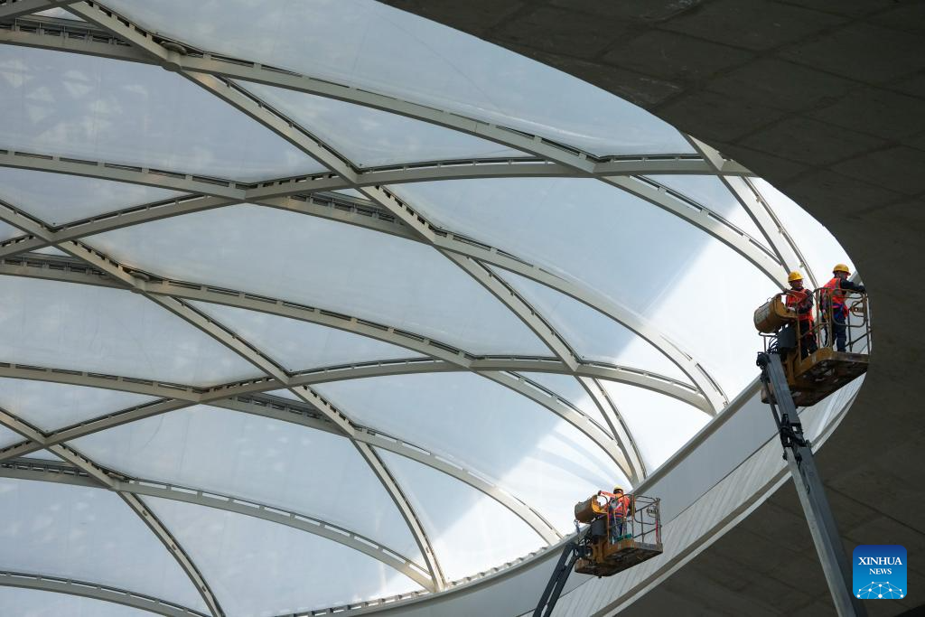 Workers are pictured at the construction site of the Beijing sub-center comprehensive transportation hub in Tongzhou District, sub-center of Beijing, capital of China, Feb. 26, 2025. The construction of the Beijing sub-center comprehensive transportation hub, Asia's largest underground transportation complex, is proceeding smoothly. The hub will link cross-regional and intercity railways, and several metro lines when completed as scheduled by the end of 2025. (Xinhua/Ju Huanzong)