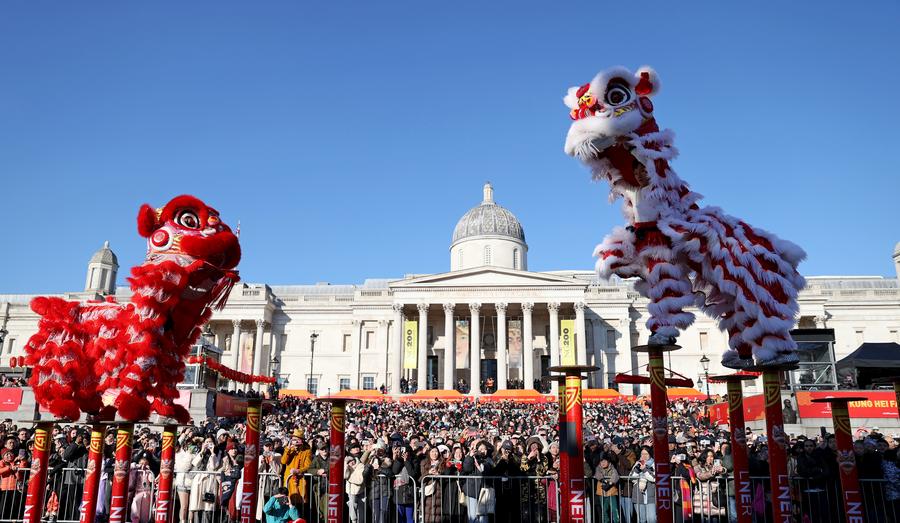 Lion dancers perform at Trafalgar Square to celebrate the Chinese New Year in London, Britain, on Feb. 2, 2025. (Xinhua/Li Ying)