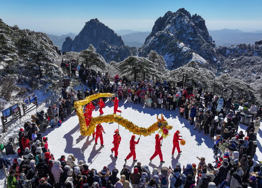 An aerial drone photo taken on Jan. 27, 2025 shows a dragon dance performance at the Huangshan Mountain scenic area in east China's Anhui Province. (Photo by Shi Yalei/Xinhua)