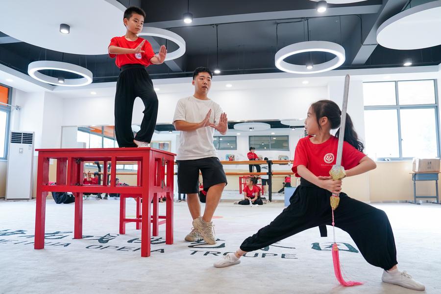 Zhou Jie, a full-time teacher of the "little Kunqu Opera training class," guides pupils at a training room of Shipai Center Primary School of Kunshan in Kunshan City, east China's Jiangsu Province, Sept. 6, 2024. (Xinhua/Li Bo)