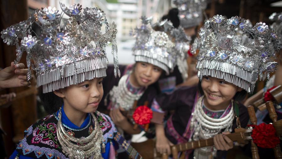 Children learn to dress up with traditional headgear at a primary school in Longsheng Town, south China's Guangxi Zhuang Autonomous Region, June 26, 2024. (Xinhua/Wu Zhizun)