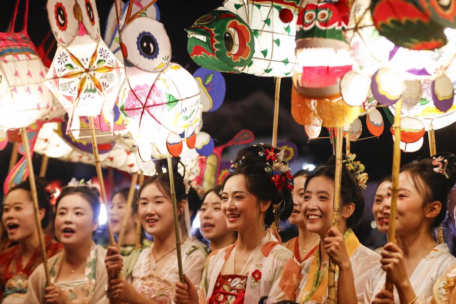 A lantern performance team parades at Hongcun Village, Huangshan City of east China's Anhui Province, Sept. 15, 2024. (Photo by Shi Yalei/Xinhua)