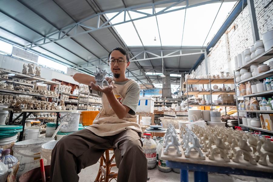 Wang Ziqiang applies glaze to a dried cat-shaped clay artifact, which was used to decorate roofs in old times, at his studio in southwest China's Yunnan Province, Sept. 18, 2024. (Xinhua/Hu Chao)