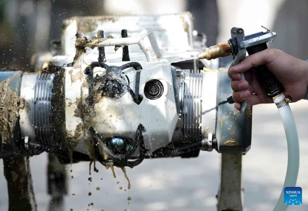 Yang Jun cleans a quadruped robot after demonstration in Hangzhou, east China's Zhejiang Province, Feb. 28, 2025. Yang Jun, born in 2003, is an engineer on the technical support team at Hangzhou-based robotics firm DEEP Robotics. An enthusiast of anime and mech models, he majored in computer science and technology in college and logged in his dreamed walk of life after graduation.