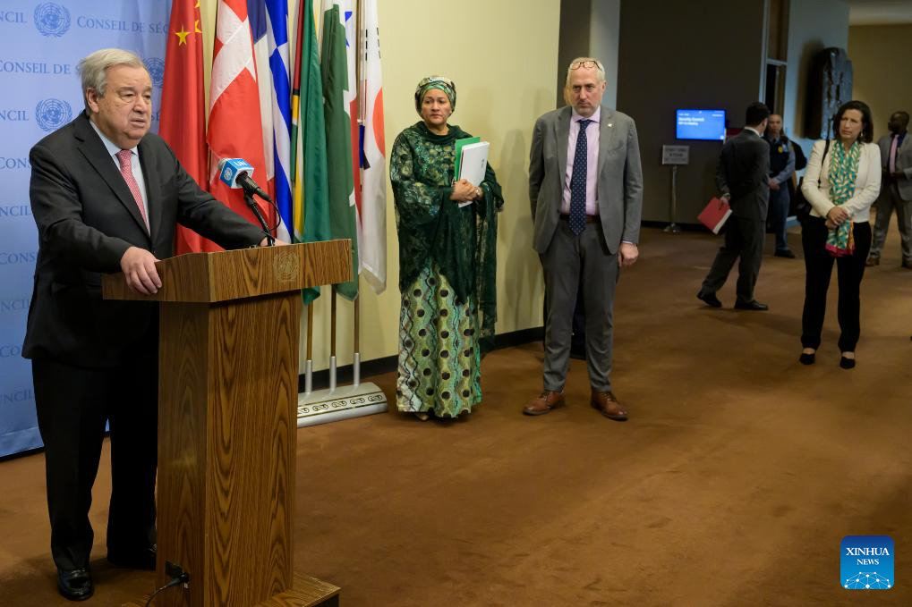 UN Secretary-General Antonio Guterres (L) speaks during a press conference at the UN headquarters in New York, on Feb. 28, 2025. The consequences of severe cuts in U.S. foreign aid will be especially devastating for vulnerable people across the world, and the move will "run counter to" Washington's global interests, UN Secretary-General Antonio Guterres warned on Friday. (Manuel Elias/UN Photo/Handout via Xinhua)