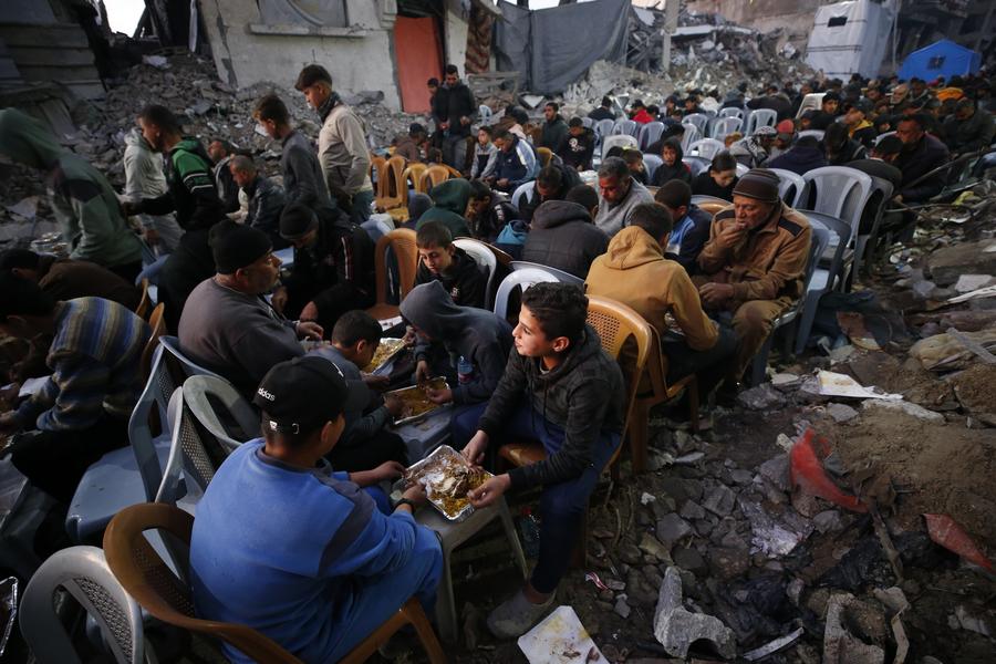 Palestinian people have their iftar meal among destroyed houses on the first day of Ramadan in the northern Gaza Strip town of Jabalia, March 1, 2025. (Photo by Mahmoud Zaki/Xinhua)