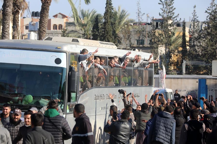 Released Palestinian prisoners wave to people on a bus in the southern Gaza Strip city of Khan Younis, on Feb. 27, 2025. Israeli authorities on Thursday began releasing more than 600 Palestinian prisoners from Israeli jails as part of the Gaza ceasefire agreement between Hamas and Israel, according to Palestinian sources. (Photo by Rizek Abdeljawad/Xinhua)