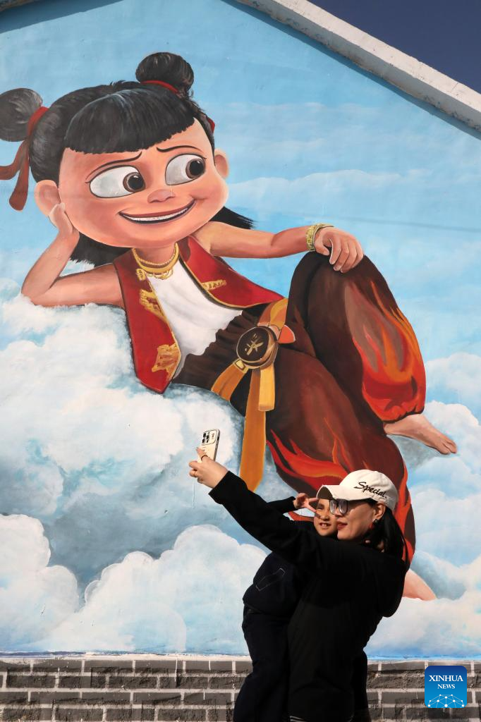 Tourists pose for photos with a wall painting featuring the hit animated film "Ne Zha 2" in Dongfeng Village of Boxing County in Binzhou, east China's Shandong Province, March 1, 2025. (Photo by Chen Bin/Xinhua)