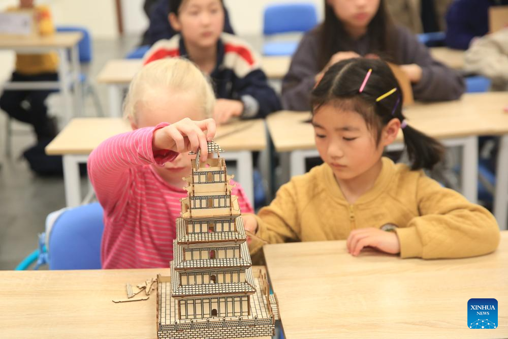 Two girls build a model of traditional Chinese tower at the Malta Chinese School in Luqa, Malta, on March 2, 2025. A Chinese cultural event held on Sunday at the Malta Chinese School offered students an immersive experience of "ancient Xi'an," one of China's most historic cities. The event, co-hosted by the China Cultural Center in Malta and the Malta Chinese School, showcased Xi'an's deep historical and cultural significance. With a history spanning more than 3,100 years, Xi'an served as the capital for 13 dynasties in Chinese history and is home to the renowned Terracotta Warriors, created during the Qin Dynasty (221-207 BC). (Xinhua/Chen Wenxian)