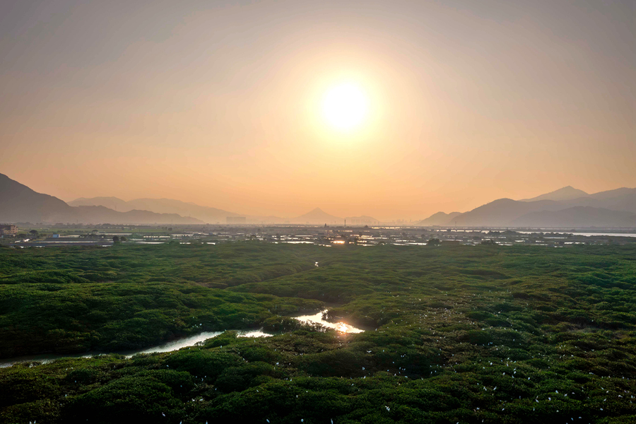 Egrets fly above the Zhangjiangkou National Mangrove Nature Reserve in Yunxiao county, southeast China's Fujian Province. (Photo/Dai Yuansheng)