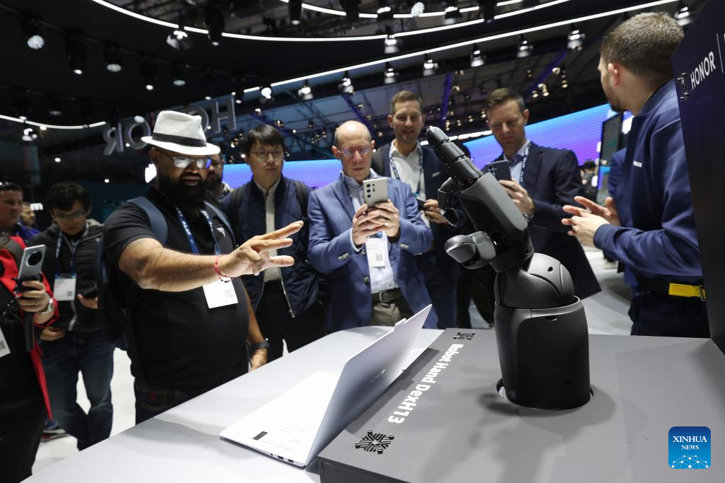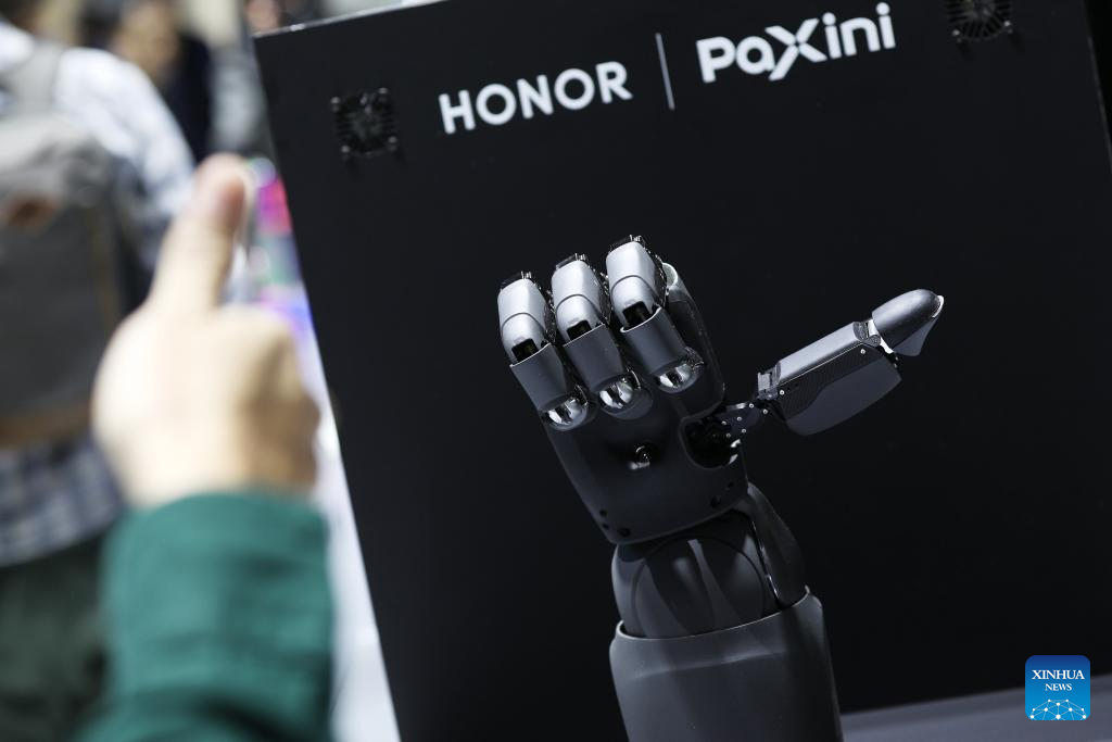 A visitor interacts with a robot hand during the 2025 Mobile World Congress in Barcelona, Spain, on March 3, 2025. The 2025 Mobile World Congress (MWC) opened here on Monday, bringing together industry leaders, policymakers, and technology innovators to explore advancements in 5G, artificial intelligence (AI), and advanced connectivity. (Xinhua/Zhao Dingzhe)