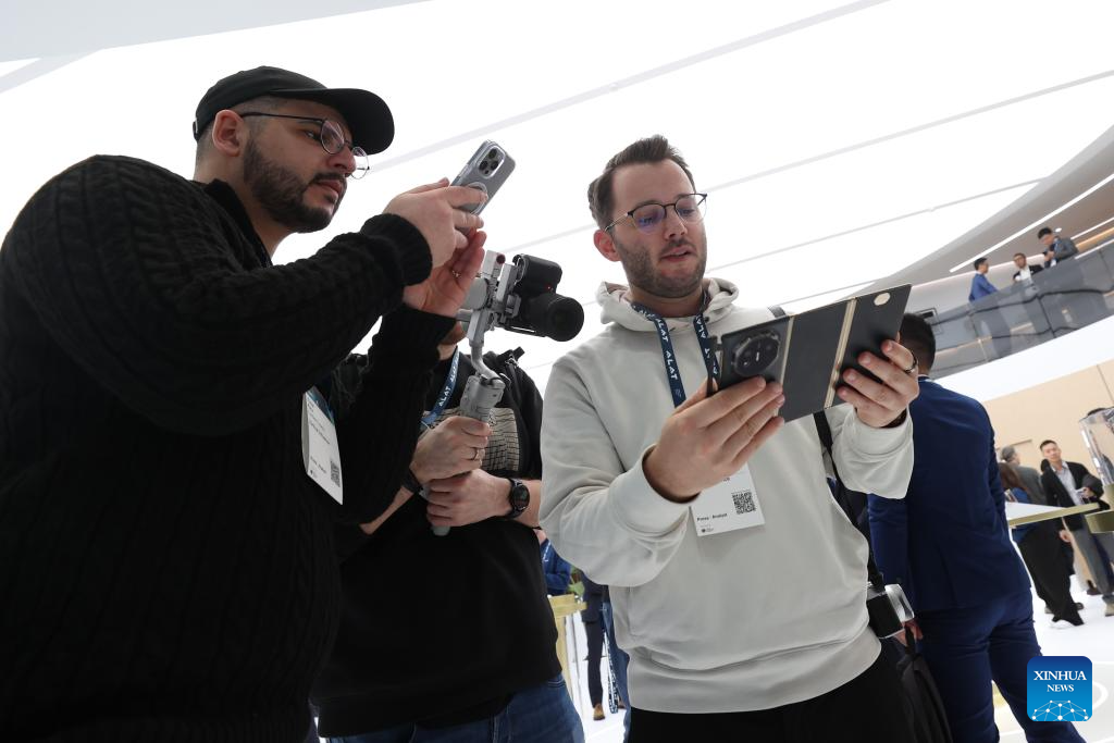 A man takes photos of smartphones during the 2025 Mobile World Congress in Barcelona, Spain, on March 3, 2025. The 2025 Mobile World Congress (MWC) opened here on Monday, bringing together industry leaders, policymakers, and technology innovators to explore advancements in 5G, artificial intelligence (AI), and advanced connectivity. (Xinhua/Zhao Dingzhe)