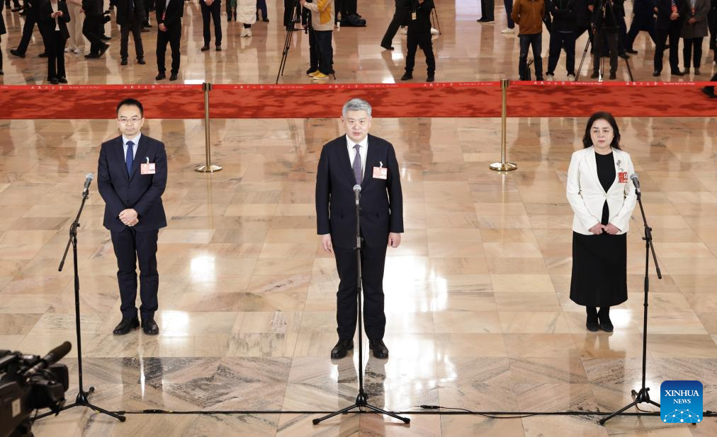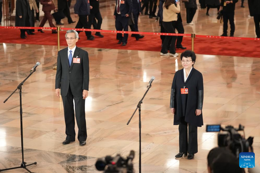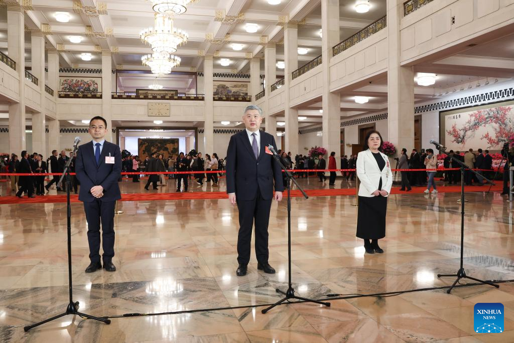 Members of the 14th National Committee of the Chinese People's Political Consultative Conference (CPPCC) attend a group interview ahead of the opening meeting of the third session of the 14th CPPCC National Committee at the Great Hall of the People in Beijing, capital of China, March 4, 2025. (Xinhua/Zhang Yuwei)