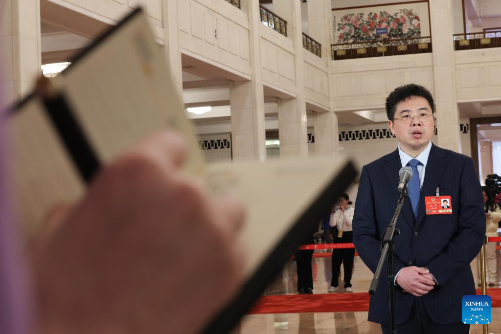 Yan Jianbing, a member of the 14th National Committee of the Chinese People's Political Consultative Conference (CPPCC), attends a group interview ahead of the opening meeting of the third session of the 14th CPPCC National Committee at the Great Hall of the People in Beijing, capital of China, March 4, 2025. (Xinhua/Zhang Yuwei)