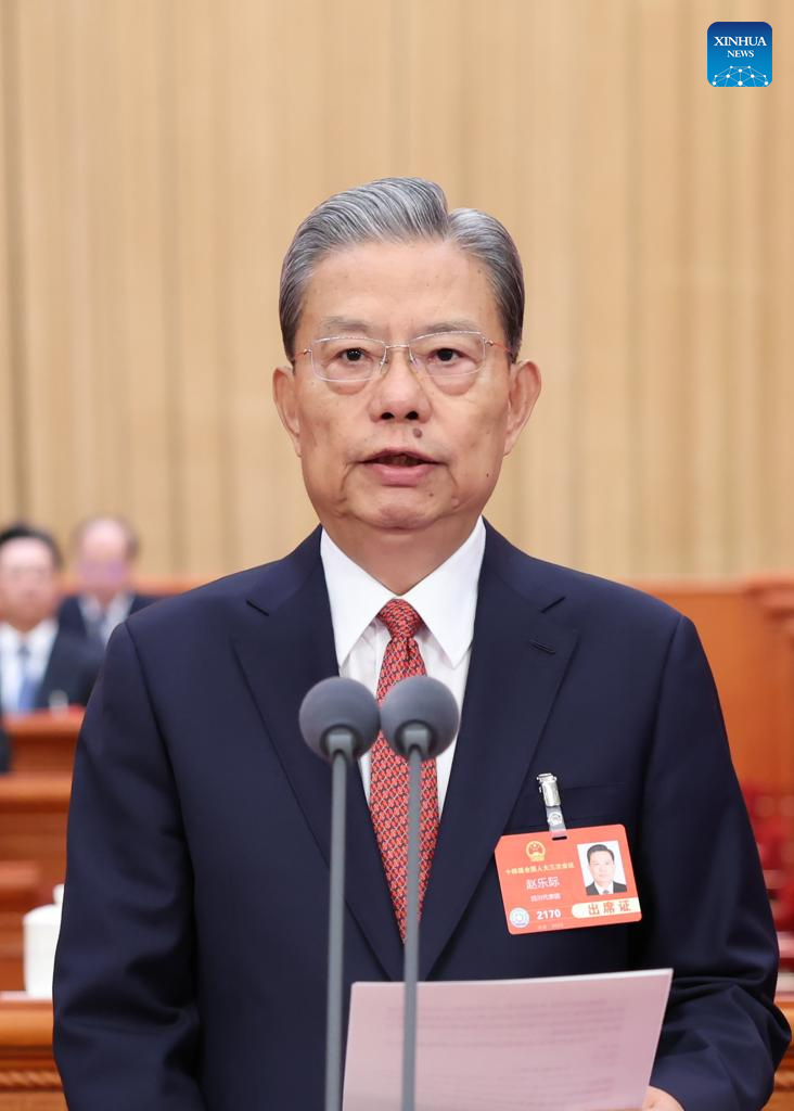 Zhao Leji presides over the opening meeting of the third session of the 14th National People's Congress (NPC) at the Great Hall of the People in Beijing, capital of China, March 5, 2025. (Xinhua/Huang Jingwen)
