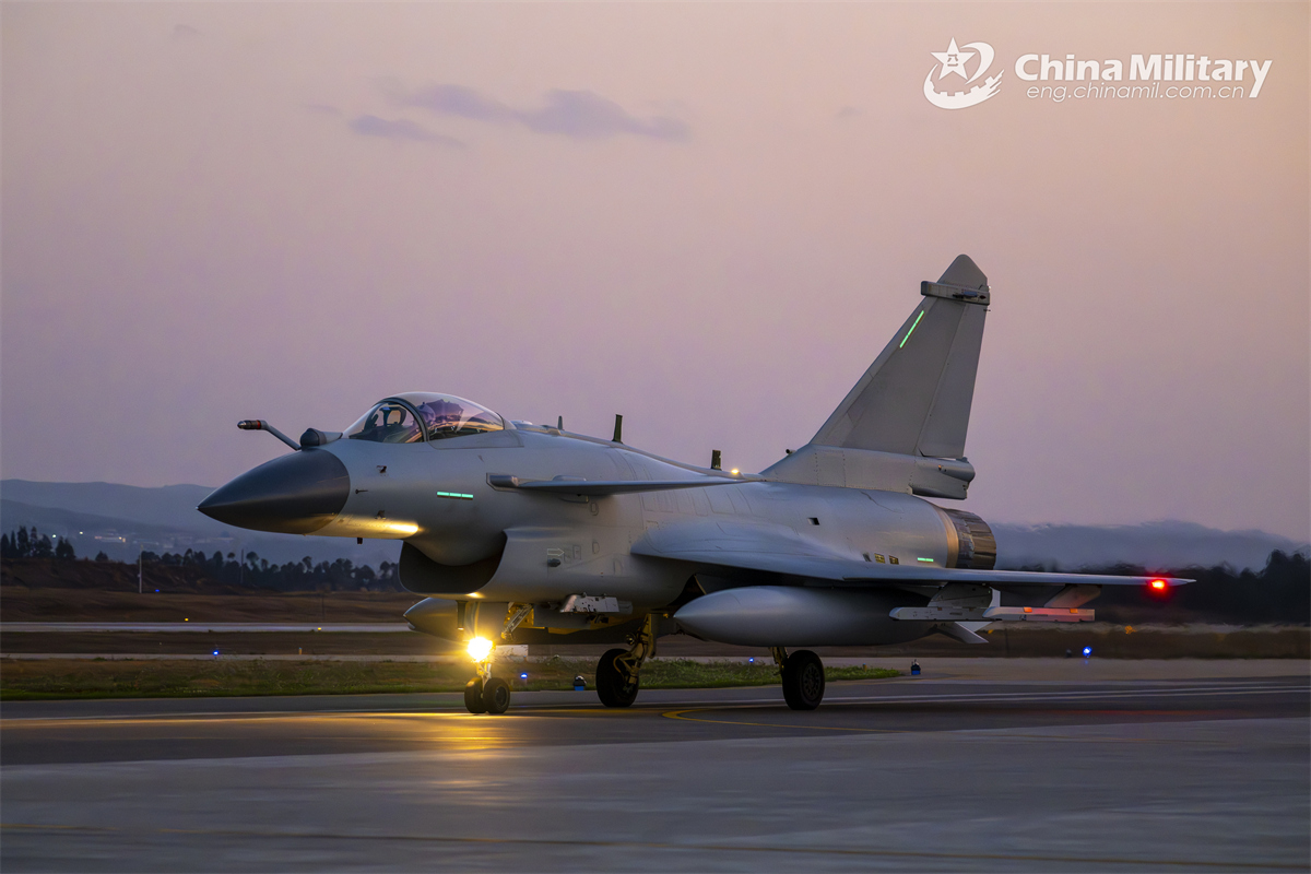 A J-10C fighter jet attached to an aviation brigade with the air force under the Chinese PLA Southern Theater Command taxis on the runway during a round-the-clock flight training exercise in late February 2025. (eng.chinamil.com.cn/Photo by Xiao Rui)