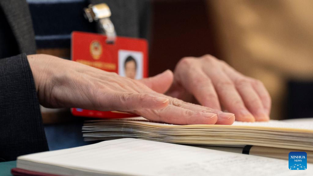 A national political advisor reads the government work report in Braille at a meeting attended by national political advisors from the sector of welfare and social security at the third session of the 14th National Committee of the Chinese People's Political Consultative Conference (CPPCC) in Beijing, capital of China, March 5, 2025. During this year's two sessions, a Braille version of the government work report was provided for the first time to members of the CPPCC National Committee with visual impairments. The special document highlights China's care and support for people with disabilities. (Xinhua/Cai Yang)