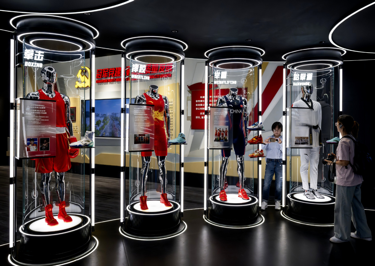 Visitors check out sportswear at an innovation exhibition facility of Anta in Jinjiang, Fujian province. (Wei Peiquan/Xinhua)