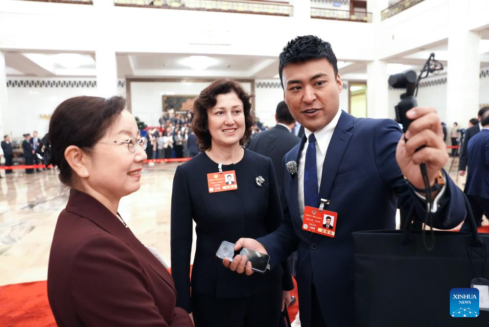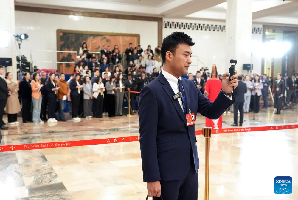 Henizat Tohti takes a short video at the Great Hall of the People in Beijing, capital of China, March 7, 2025.