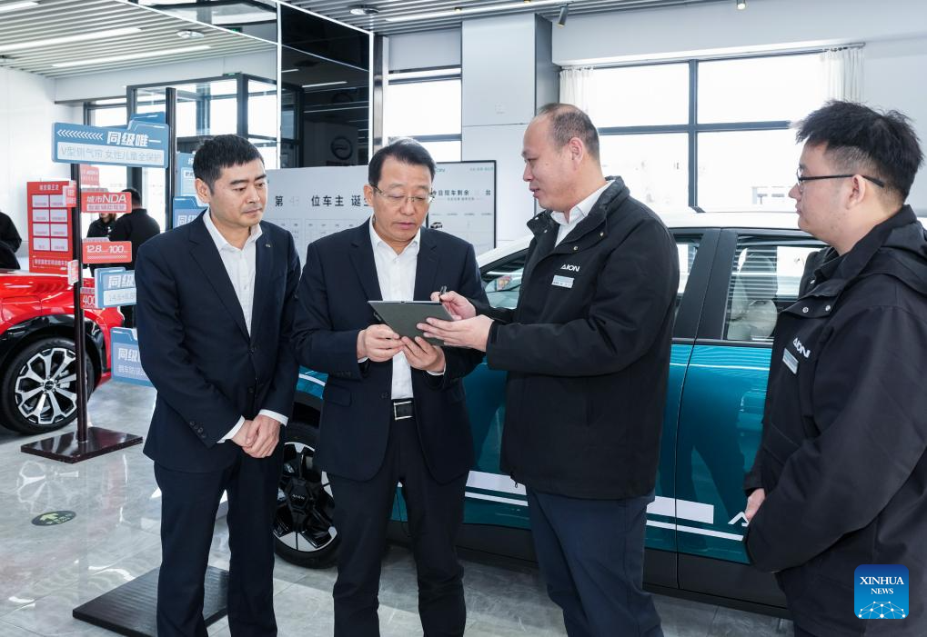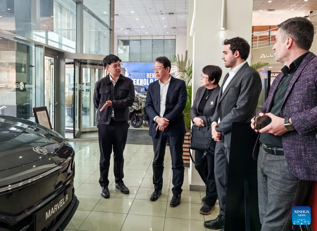 Feng Xingya (2nd L), a deputy to the 14th National People's Congress (NPC), learns about the sales of Chinese new energy vehicles in Istanbul, Trkiye, Feb. 27, 2025.(Xinhua)