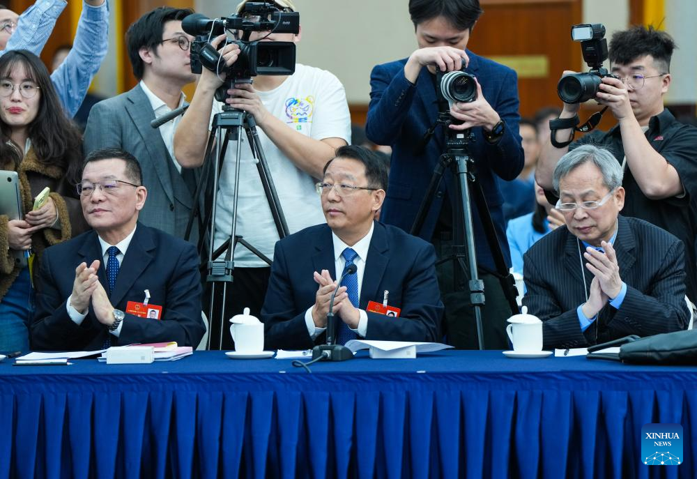 Feng Xingya (C), a deputy to the 14th National People's Congress (NPC), attends a group meeting of the delegation of Guangdong Province at the third session of the 14th NPC in Beijing, capital of China, March 6, 2025.(Xinhua/Liu Dawei)